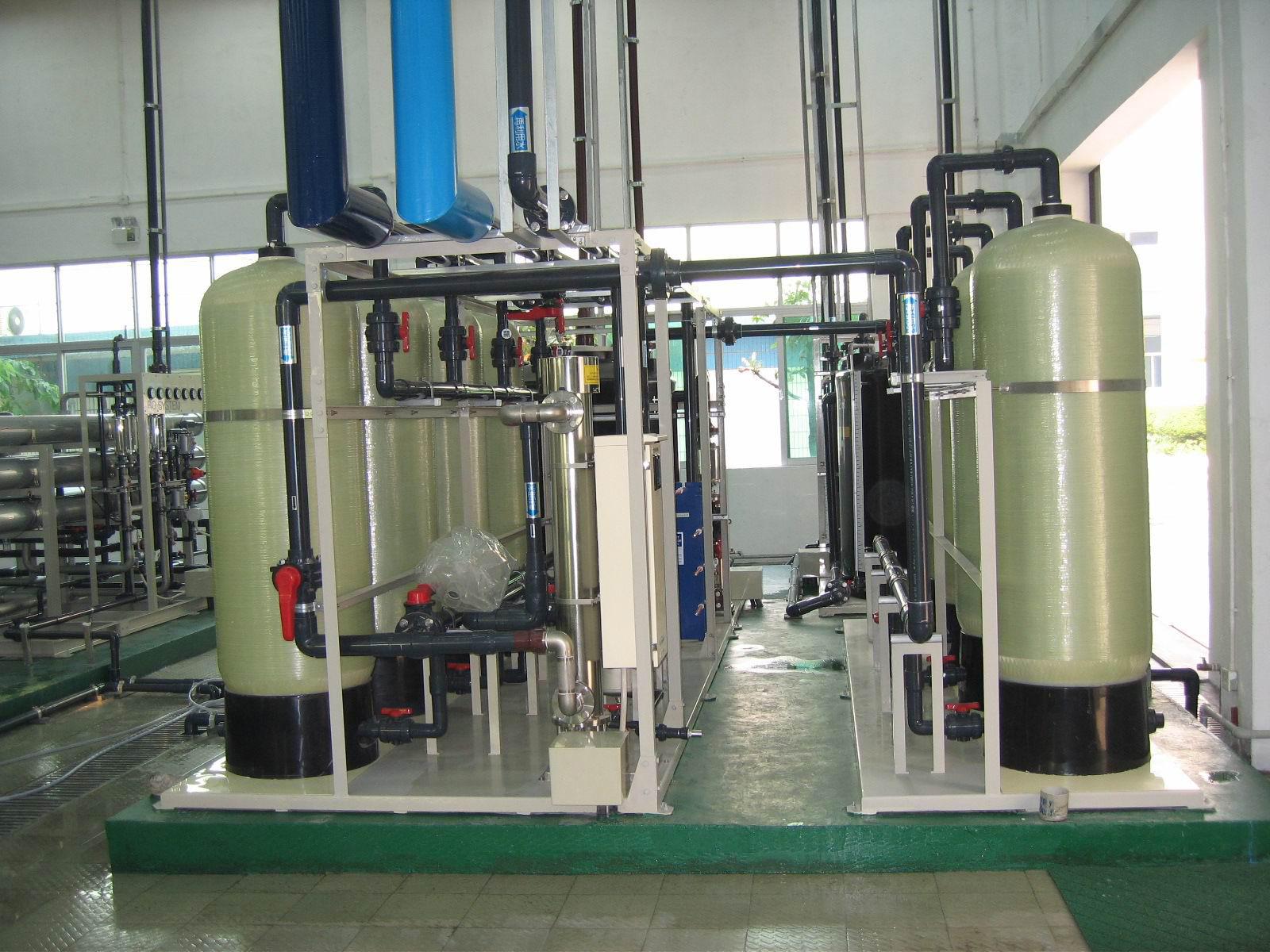 為滿足用戶需要,達到符合標準的水質(zhì),盡可能地減少各級的污染,延長設(shè)備的使用壽命、降低操作人員的維護工作量.在工藝設(shè)計上,取達國家自來水標準的水為源水,再設(shè)有介質(zhì)過濾器,活性碳過濾器,鈉離子軟化器、精密過濾器等預(yù)處理系統(tǒng)、RO反滲透主機系統(tǒng)、離子交換混床(EDI電除鹽系統(tǒng))系統(tǒng)等。 系統(tǒng)中水箱均設(shè)有液位控制系統(tǒng)、水泵均設(shè)有壓力保護裝置、在線水質(zhì)檢測控制儀表、電氣采用PLC可編程控制器,真正做到了無人職守,同時在工藝選材上采用推薦和客戶要求相統(tǒng)一的方法,使設(shè)備與其它同類產(chǎn)品相比較,具有更高的性價比和設(shè)備可靠性。